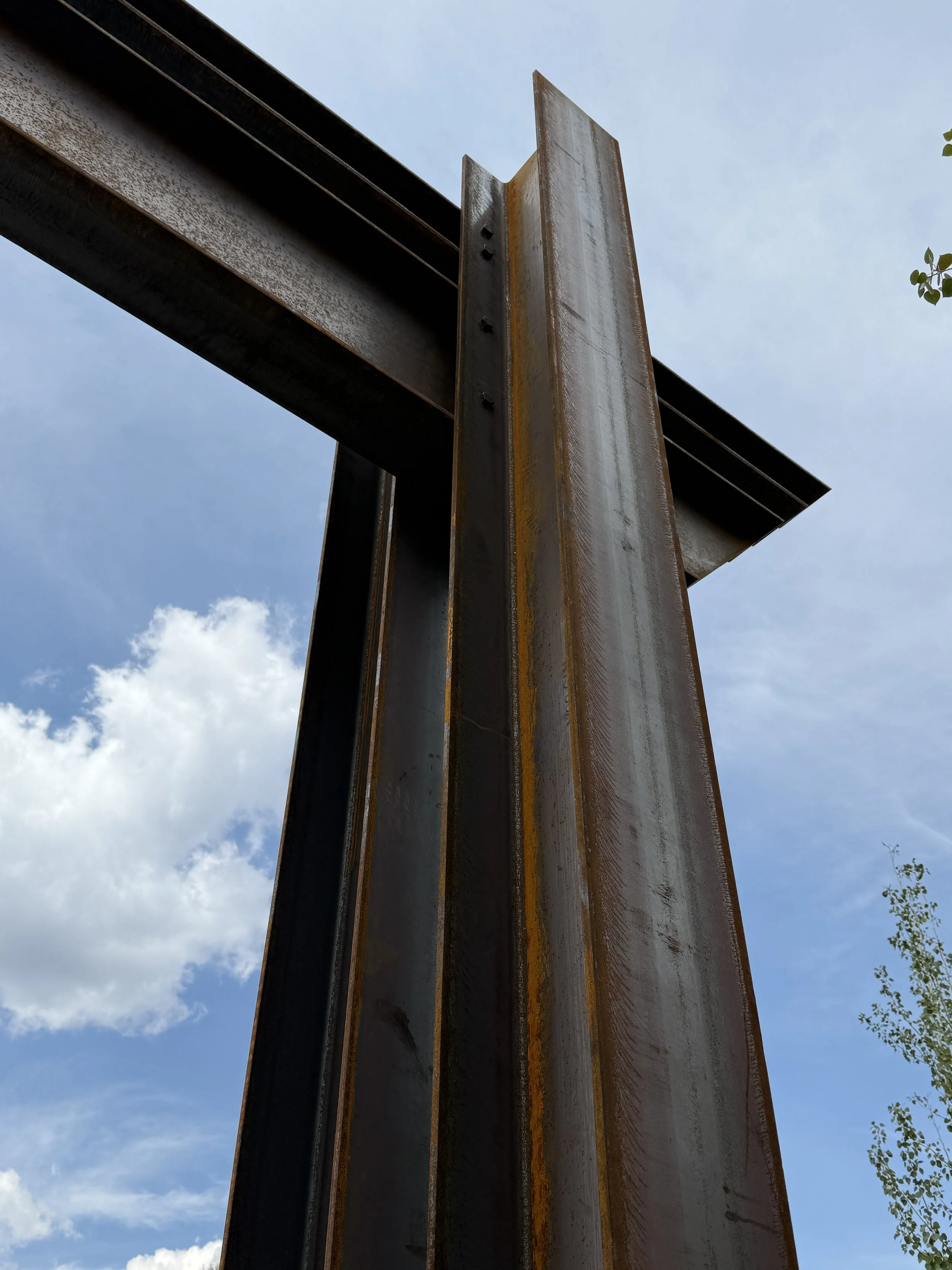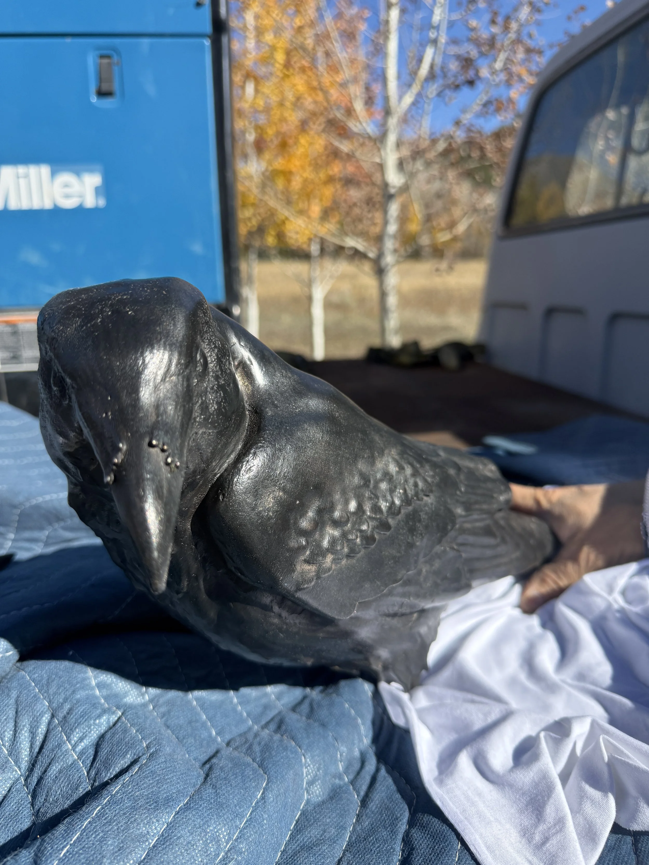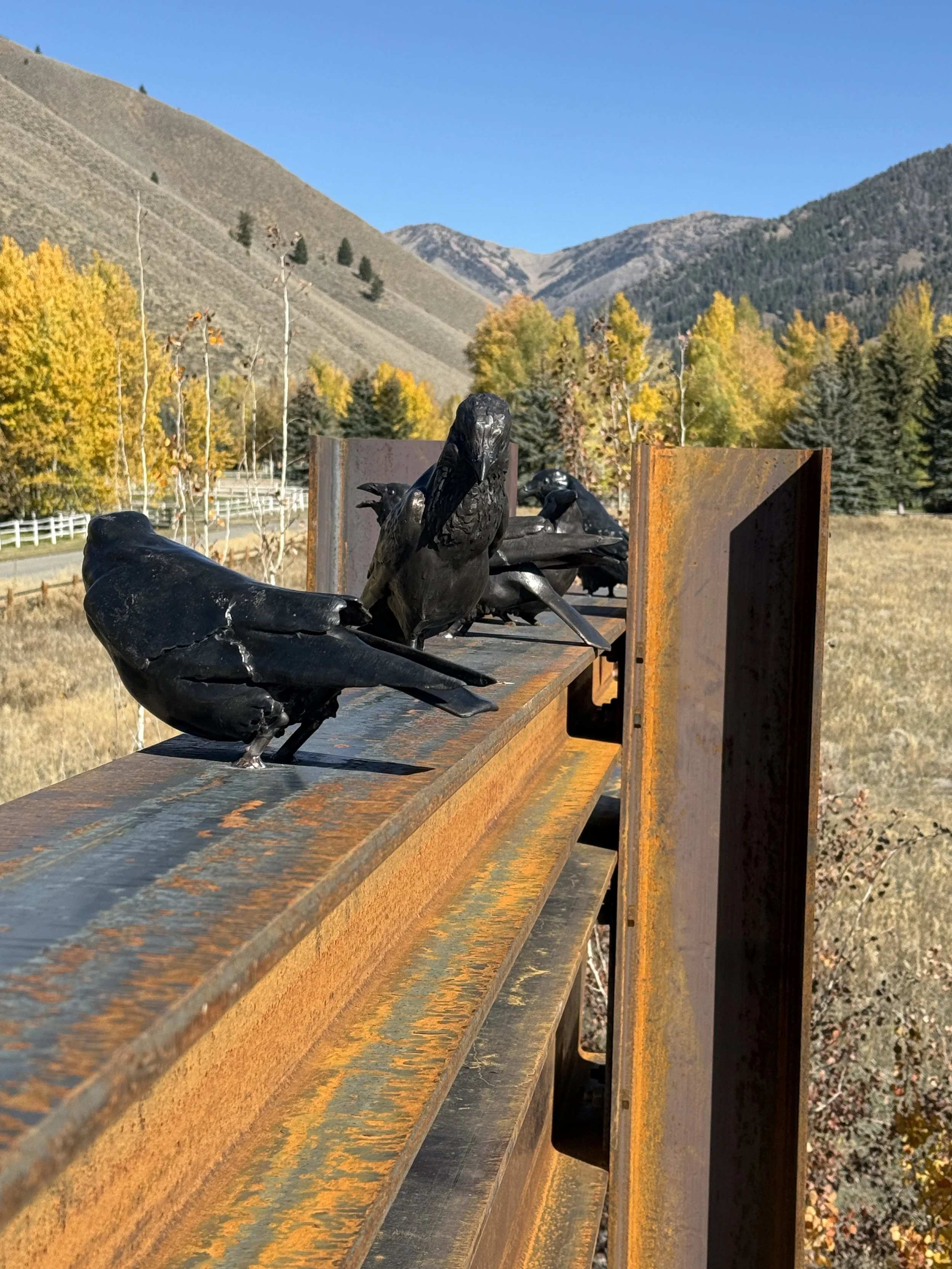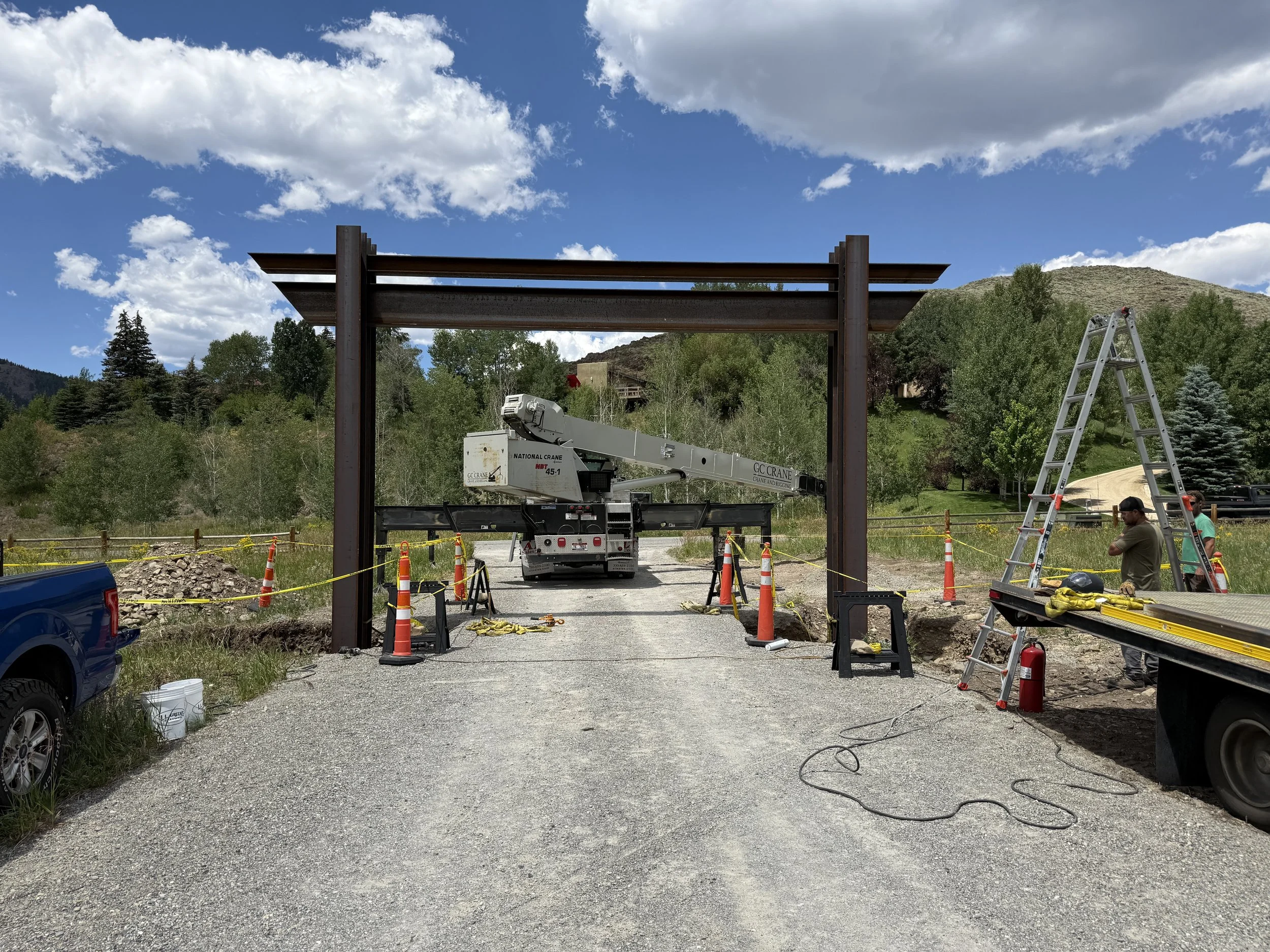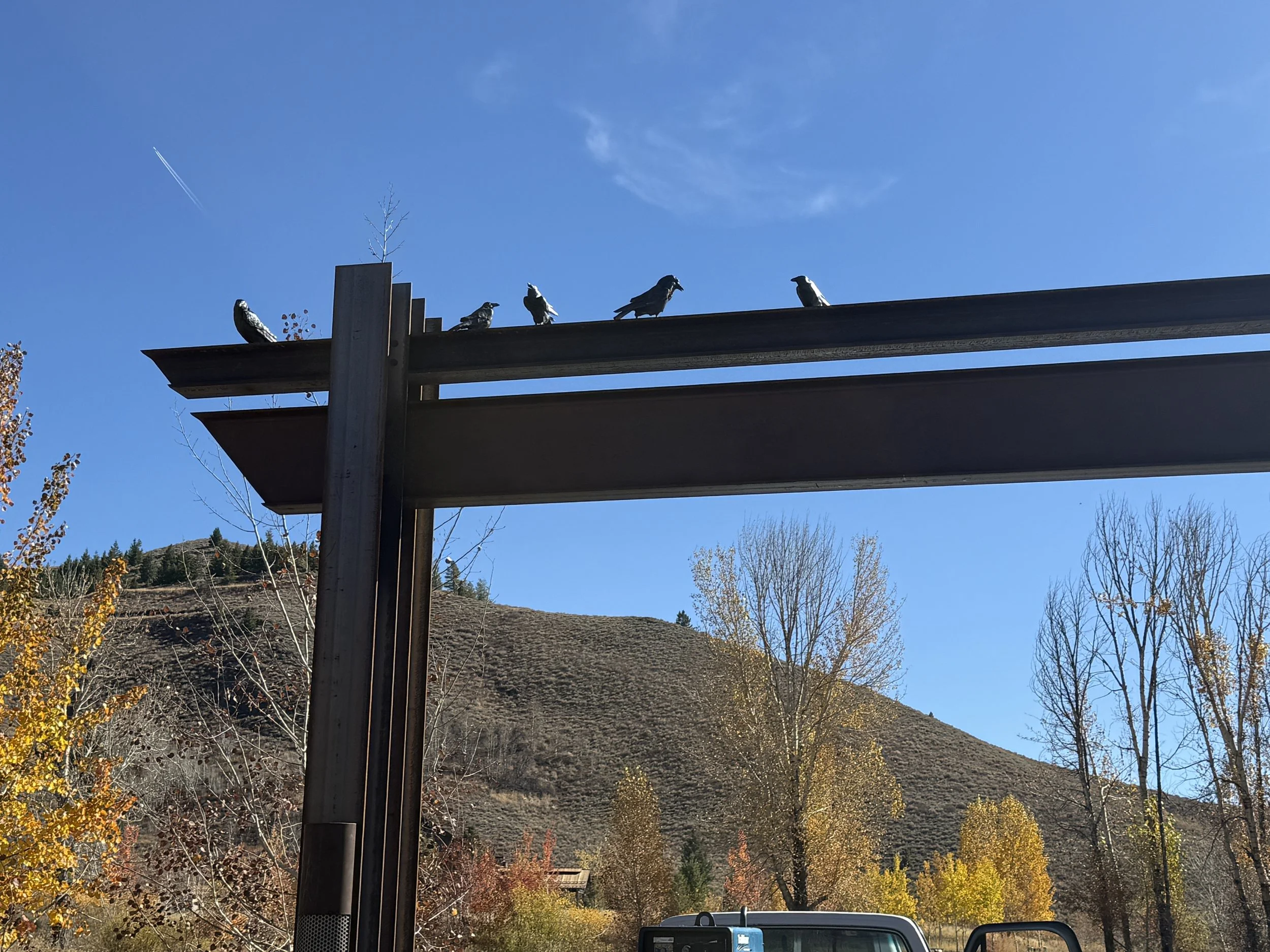 Design-build monolithic steel estate entry, bridge, cast bronze raven sculptures, landscape.